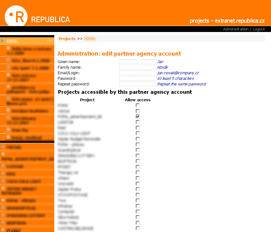 Republica vytváří pro své zákazníky přístupové účty k extranetu a určuje které části extranetu jsou přístupné jednotlivým zákazníkům.
