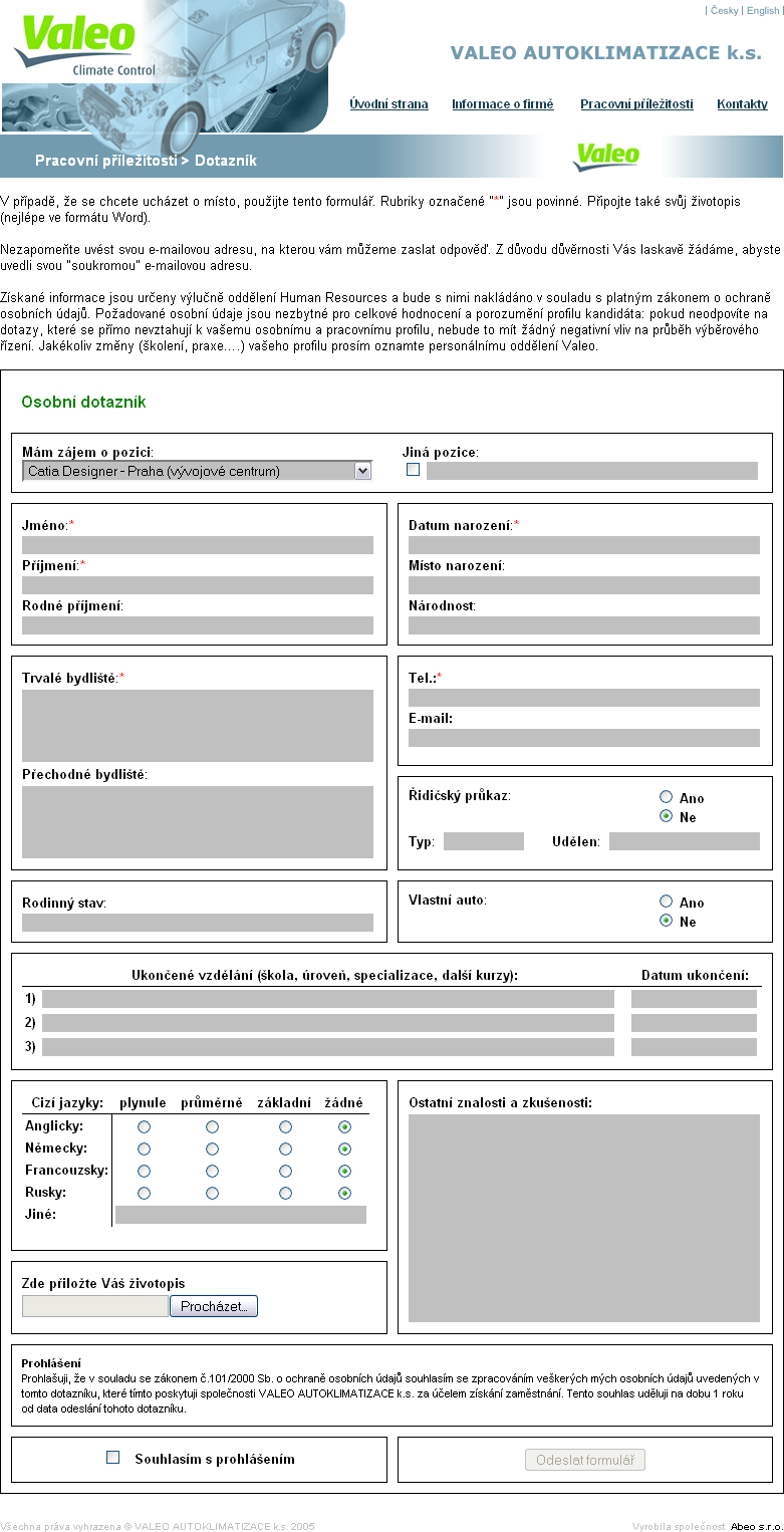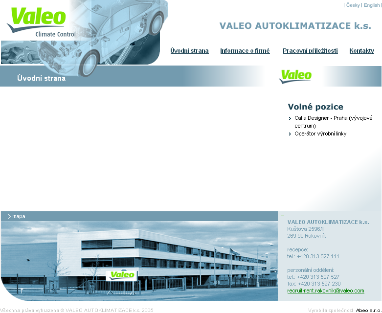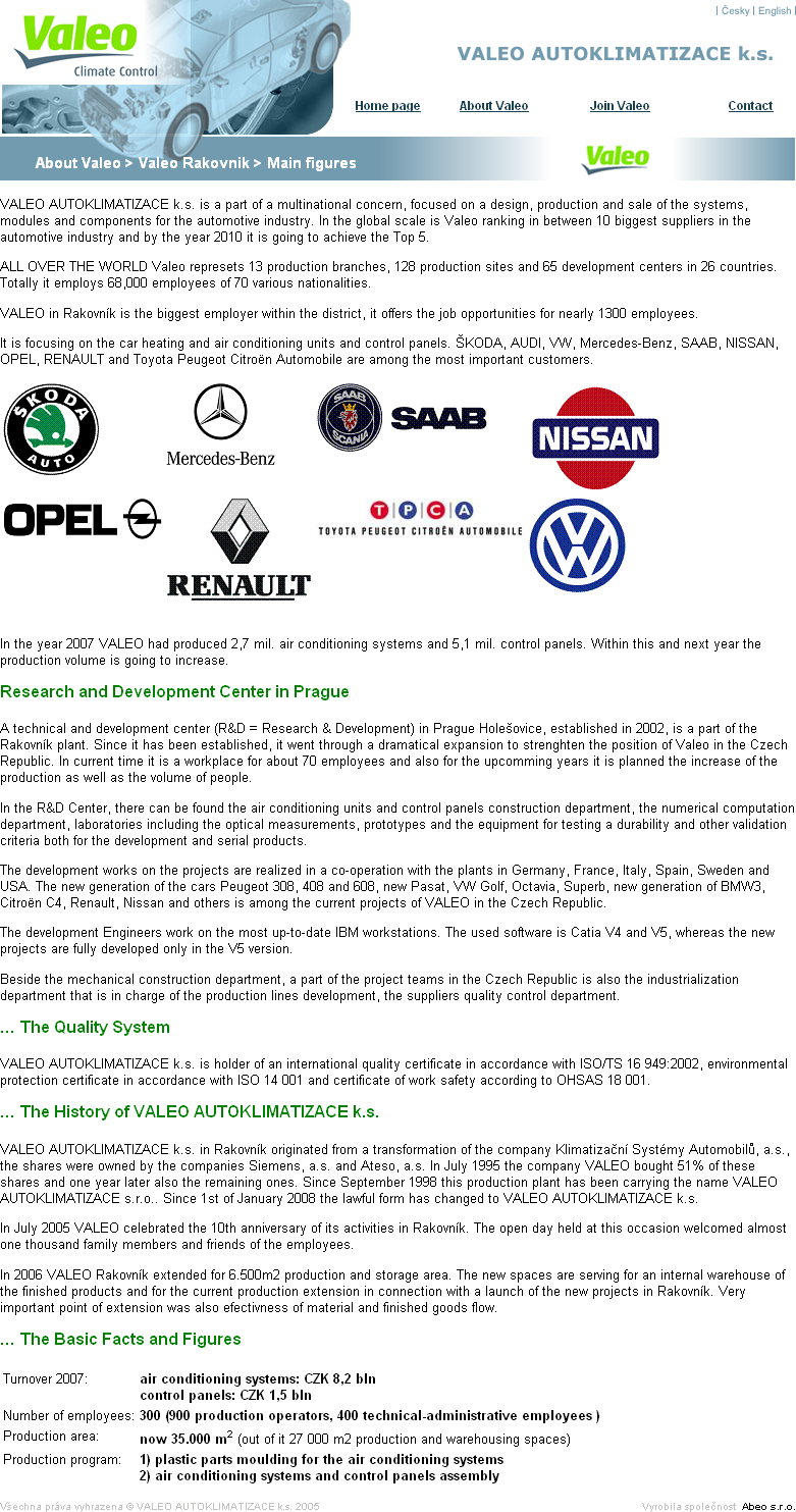 Požadavkem našeho klienta bylo navržení a vytvoření moderní www prezentace, která podpoří korporátní identitu společnosti Valeo a zároveň bude fungujícím nástrojem pro komunikaci s veřejností především pro potřeby oddělení lidských zdrojů.<