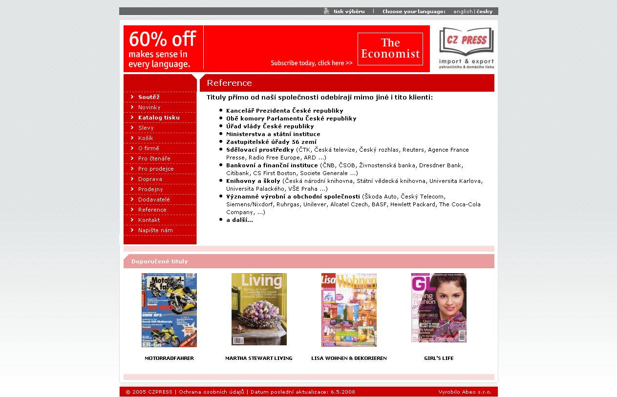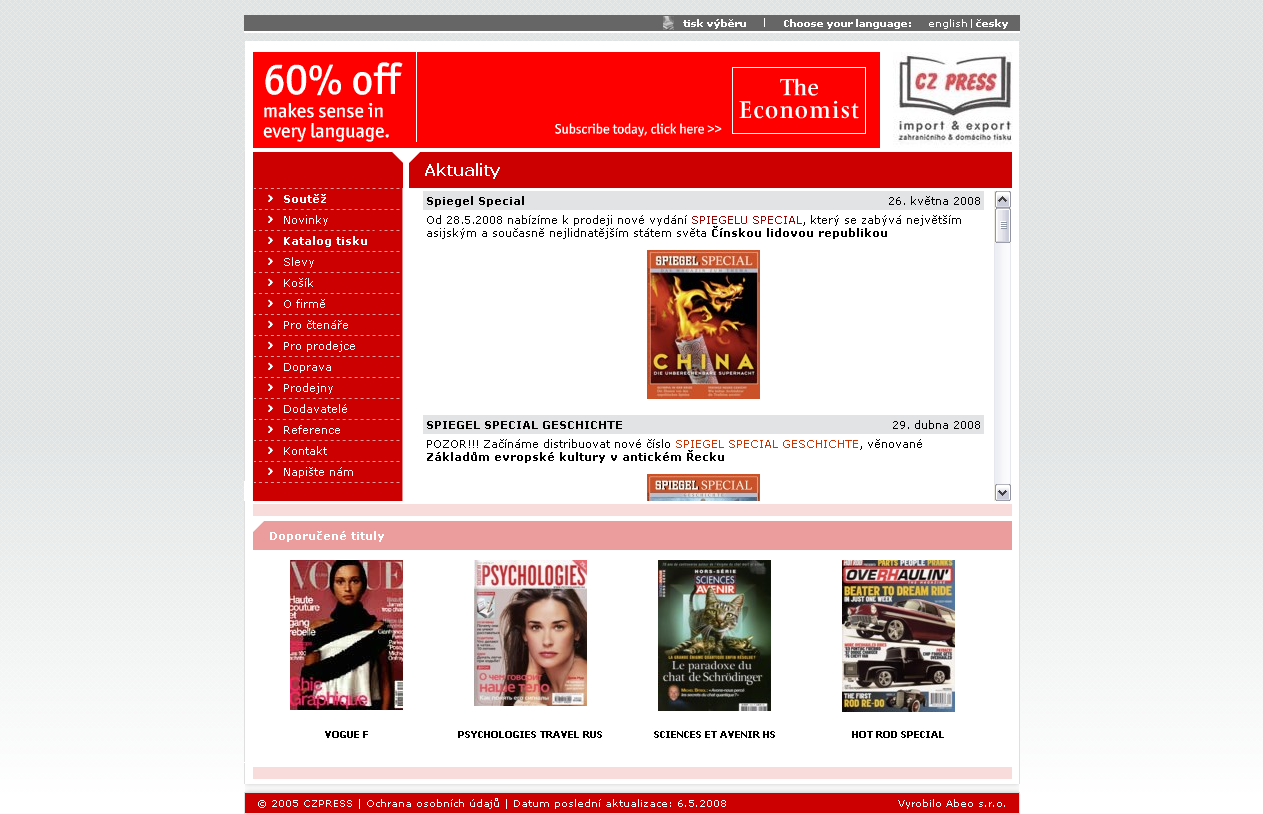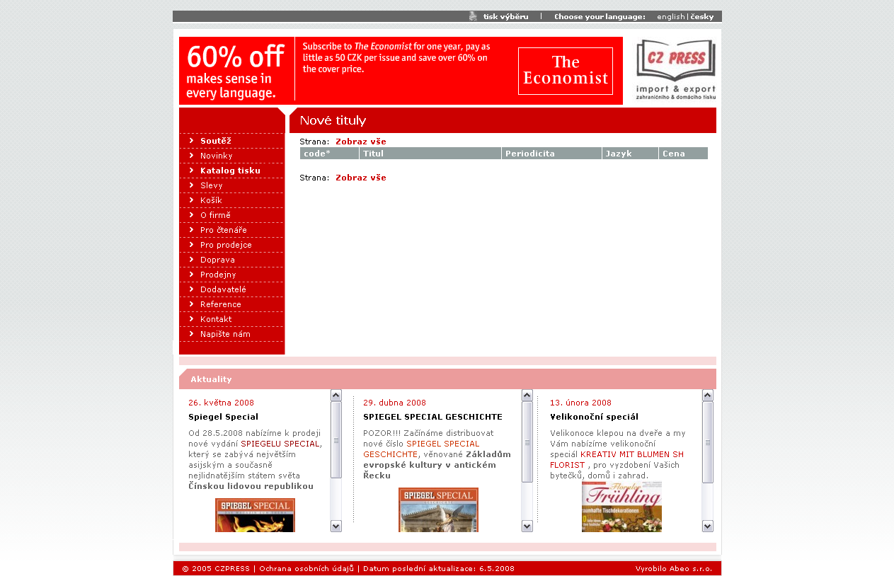 Připravili jsme tedy prezentaci jejímž základem je náš systém pro správu obsahu doplněný o importní funkcionalitu. Dále bylo nasazeno naše eShop řešení, které bylo upraveno pro specifické vlastnosti objednávanéh zboží – předplatné titulů. To vše bylo doplněno přehlednou navigací a obsahem.