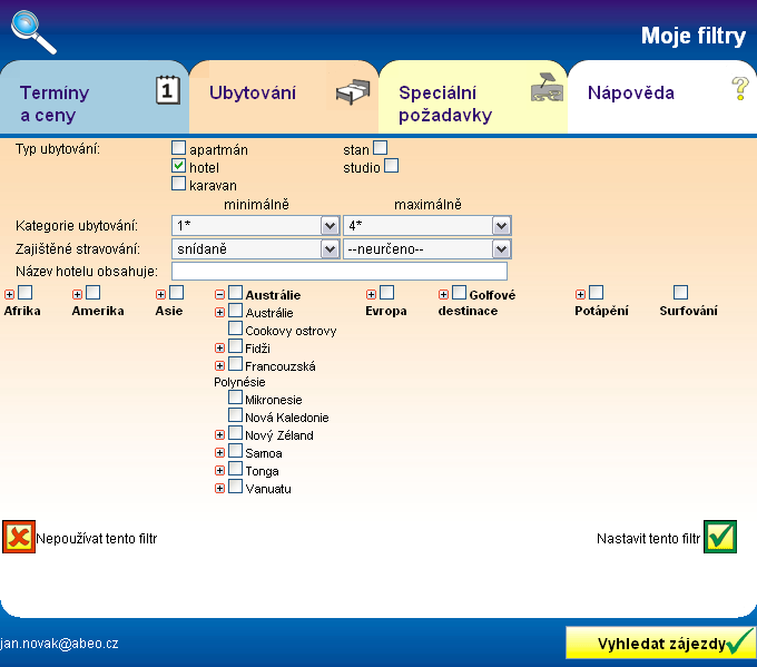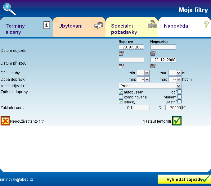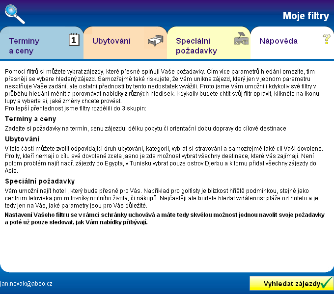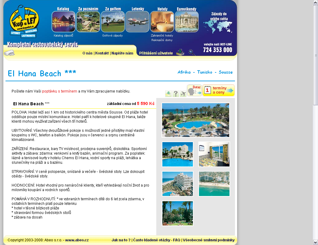 Úvodní stránka webového portálu je optimalizována pro rychlé vyhledání dovolené. Cestovní agentura přes web doporučuje konkrétní zájezdy jako Hot tipy a různé celé státy jako Aktuální hity. Zákazníci mohou také vyhledat podle názvu určitý hotel či rychle hledat zájezdy dle filtrů. Zákazníci se mohou webu registrovat k zasílání aktuálních nabídek.