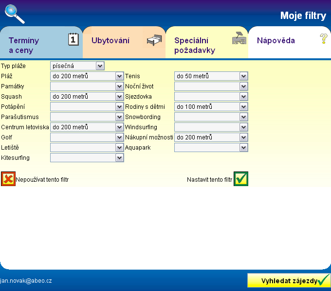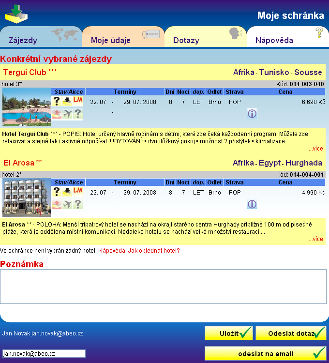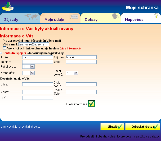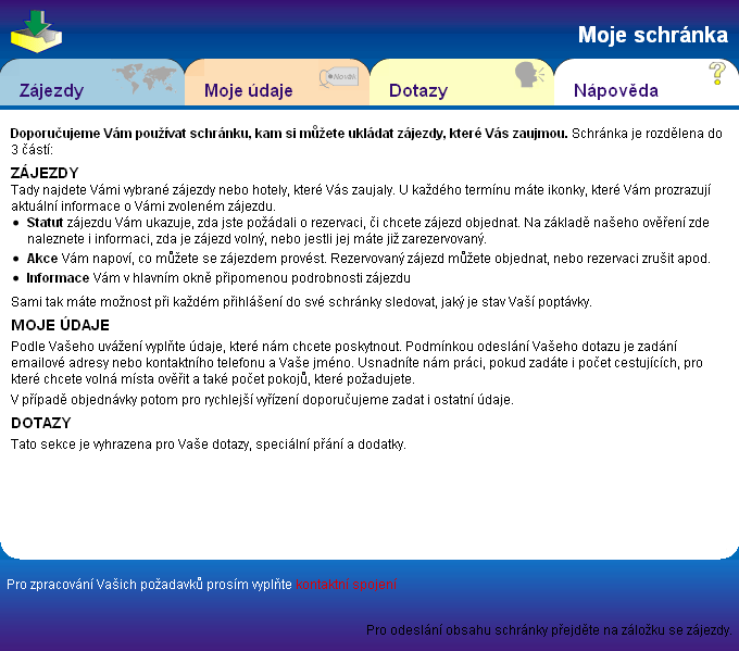 Webový portál www.kupalet.cz umožňuje každému vytvoření osobní schránky. Do schránky je možno uložit konkrétní zájezdy a osobní údaje pro objednání zájezdu. Webový portál je možno prohledávat pokročilými filtry.